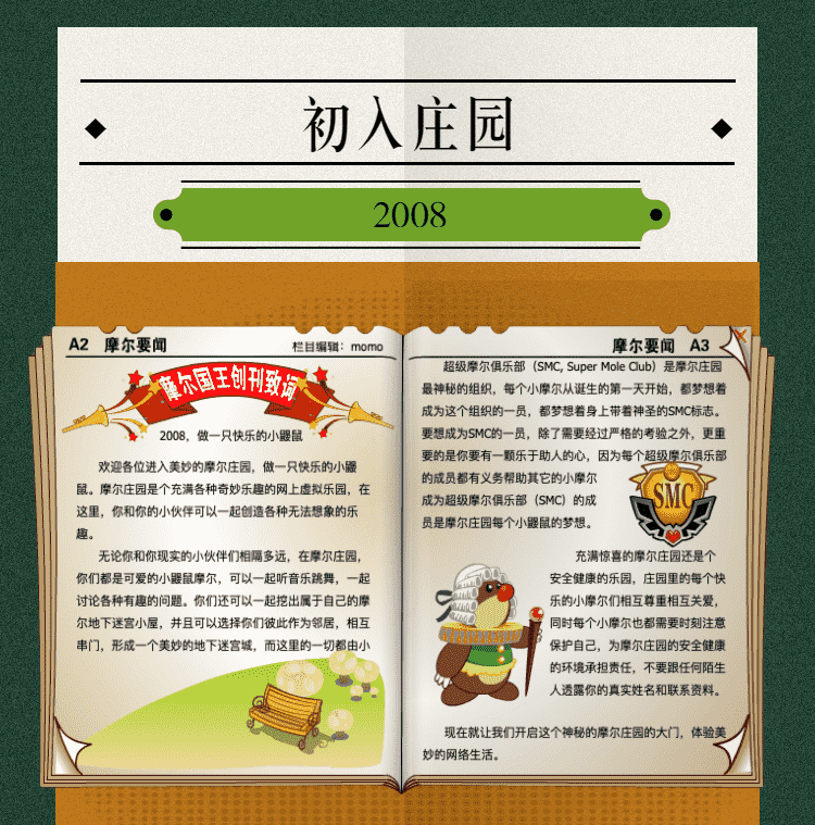 在这一年,,,摩尔庄园诞生了。。。在这里,,大家都是可爱的红鼻子鼹鼠小摩尔,,,可以一起勤劳耕作,,,一起高山滑雪......我们都是摩尔庄园的建设者。。