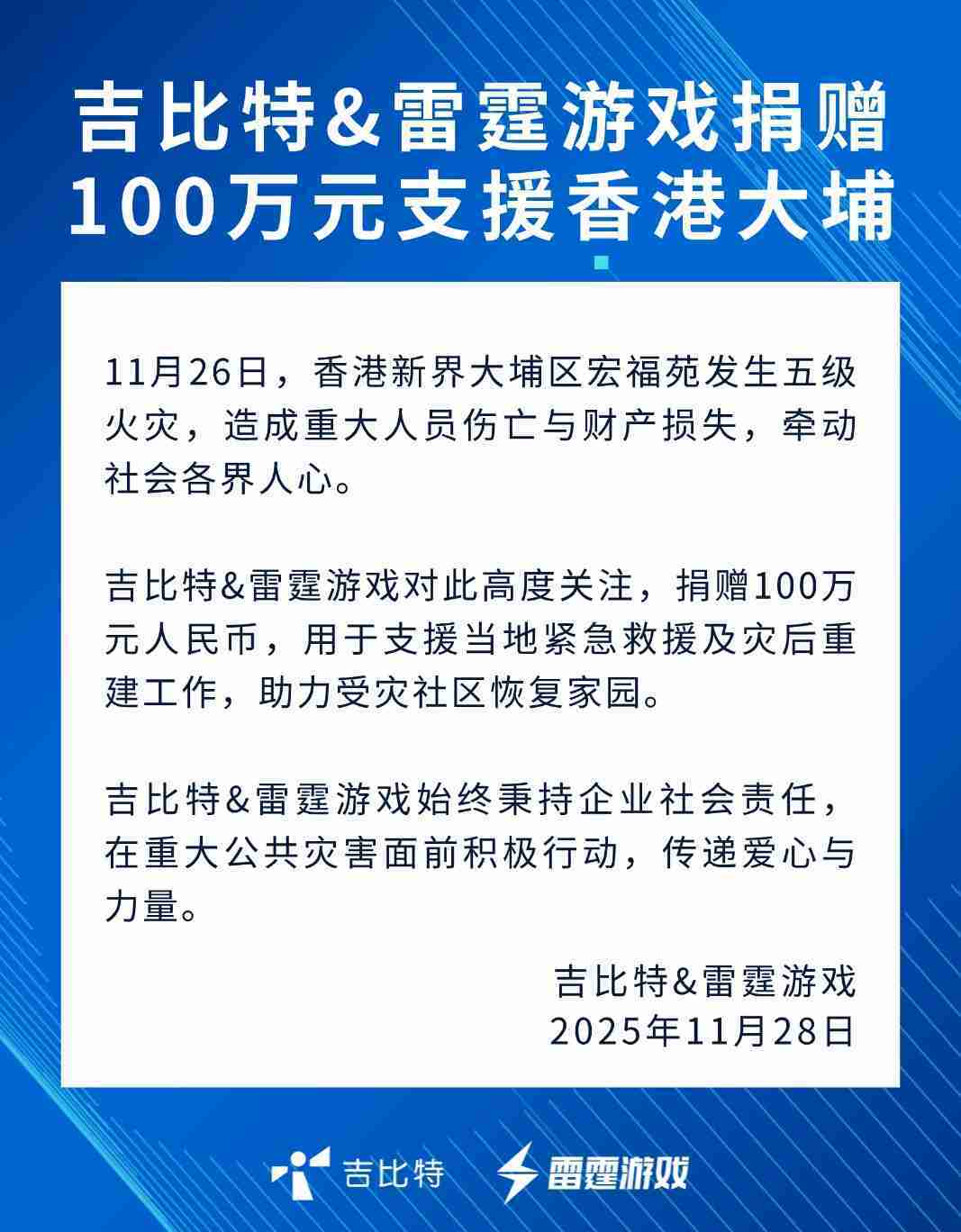 公司新闻 LEWIN乐玩&雷霆游戏捐赠100万元 支援香港大埔火灾救援及灾后重建